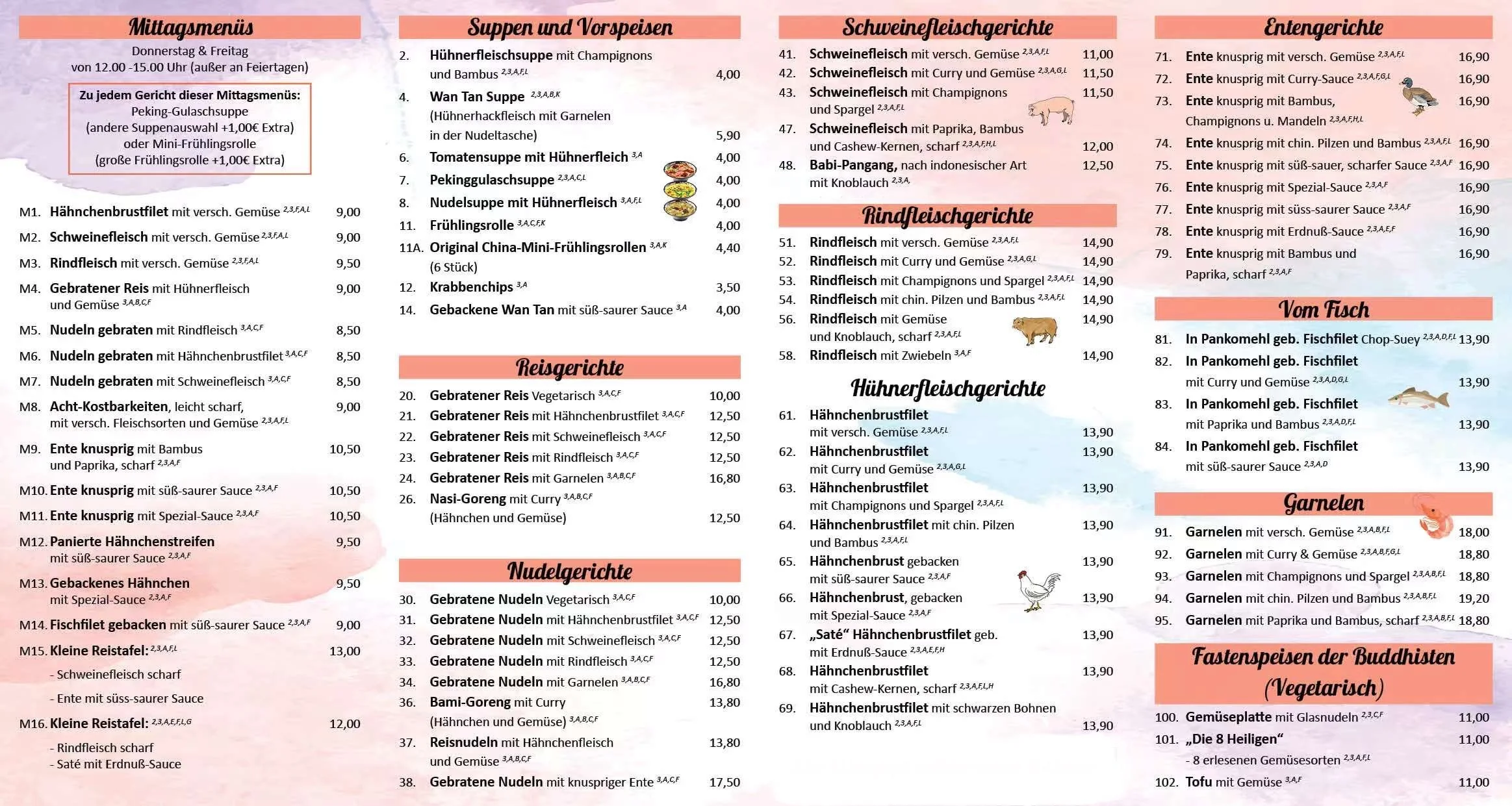 Selbstverständlich bieten wir ihnen auch chinesische Köstlichkeiten separat in unserem Menü an. Alle Speisen auch zum Mitnehmen. Gern nehmen wir Ihre telefonische Bestellung an.